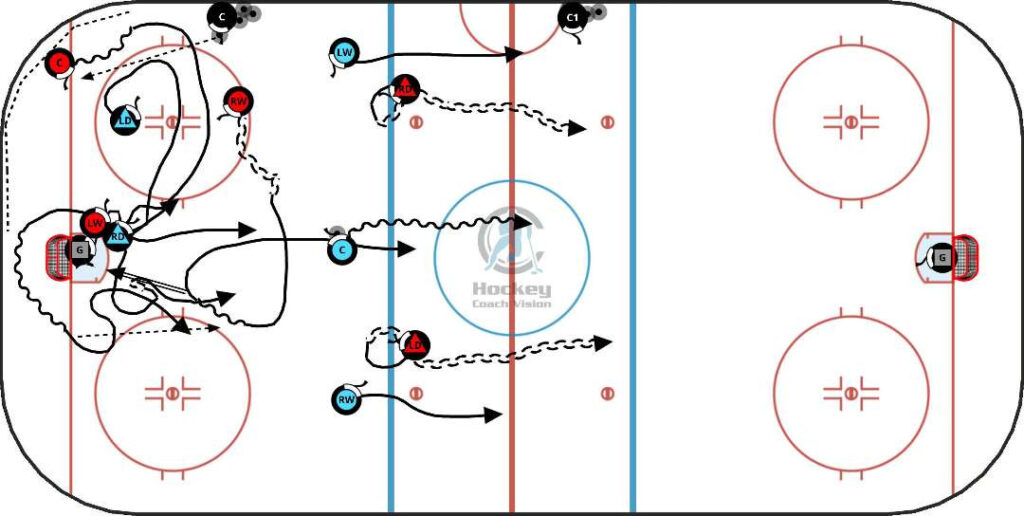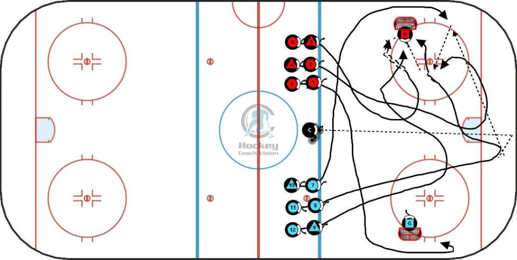 2 on 2 battle drill to work on net-front presence and defending down in front of the net.