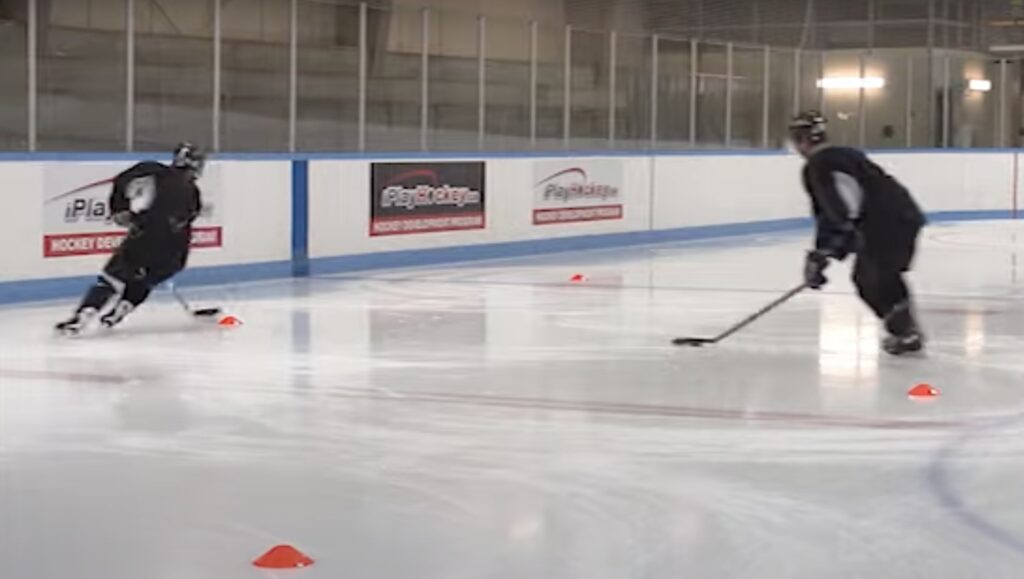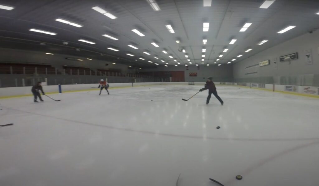 Hand-eye, quick hands, and smart finishing all in one. One player positions in front of the crease facing the goalie. Their partner pushes a puck through their legs like a rebound. The shooter must locate the puck quickly with their peripherals and fire it fast. Keep it realistic — in a game you only get […]